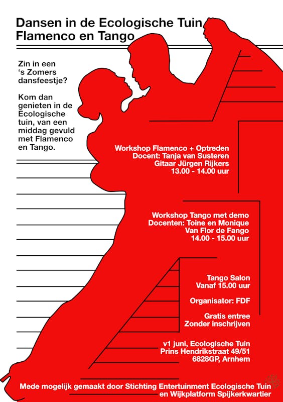 We hebben een houten dansvloer tijdelijk neergelegd in de Ecologische Tuin. Kom gratis meedoen en leer de eerste stappen van de Argentijnse Tango. Ben je volleerd kom dan daarna lekker vrij dansen. Vanaf 15:00 uur. En mis vooraf de Flamenco demonstratie niet!
