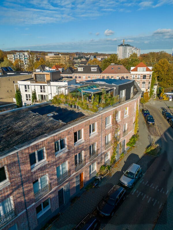 Een bijzonder onderdeel van de rondleiding is een bezoek aan een unieke woning van het Dullerthof met kas op het dak. Deze woning, bewoond door een architect, laat zien hoe stedelijk wonen letterlijk en figuurlijk naar een hoger niveau kan worden getild. Boven op het dak is een groene oase ontstaan – met een kas van hergebruikte onderdelen, een tuinmuur van gerecycled plastic en een verrassend comfortabele ruimte die de seizoenen voelbaar maakt. De bewoner deelt zijn woonbeleving en vertelt over de initiatieven die zijn ontstaan in het woonblok en de nabije buurt.