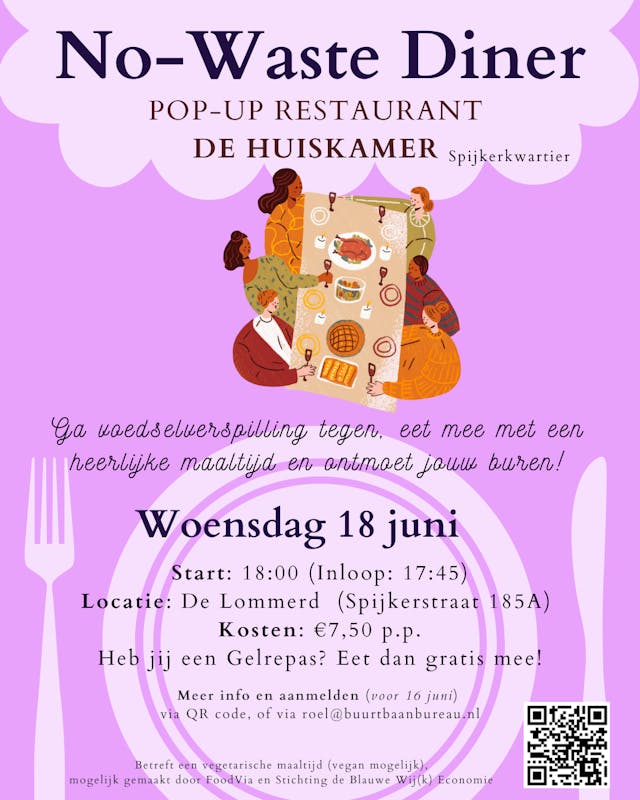 Om voedselverspilling tegen te gaan en bewuster met voeding om te gaan, organiseren wij vanuit de Blauwe Wijk Economie, samen met FoodVia een No-Waste diner. We halen onze groentes op bij verschillende ondernemers uit het Spijkerkwartier, en koken daarmee een lekkere seizoensgebonden maaltijd.