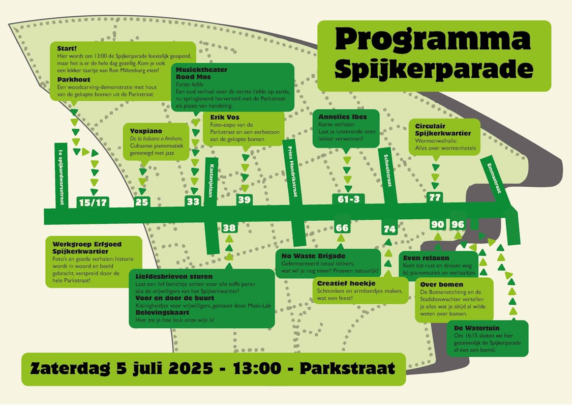 Kom je ook naar de Spijkerparade? We hebben allerlei leuks in petto! Op zaterdag 5 juli worden voortuinen in de Parkstraat omgetoverd tot podia en platforms, waar je allerlei leuks kan vinden! Ook voor kinderen is er van alles te doen, Om 13:00 is de feestelijke opening op Parkstraat 15, en om 16:00 sluiten we de parade af in de watertuin. Kom ook! Meer weten? Kijk op www.spijkerparade.nl!