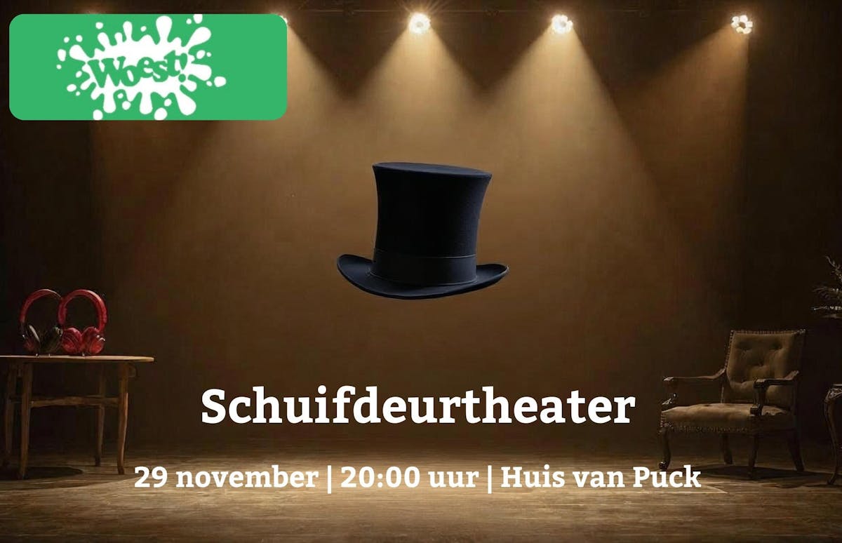 Wil je zelf ook eens het impro podium op? Grijp dan je kans en doe mee met schuifdeurtheater op zaterdag 29 november. Om 20.00u in Huis van Puck. Liever gewoon komen kijken op het pluche, dat kan ook! Koop jouw kaartje à €10 via de ticketservice: https://shop.ikbenaanwezig.nl/tickets/event/schuifdeurtheater-speel-zelf-ook-mee