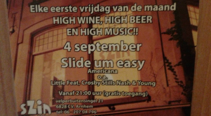 Elke 1e vrijdag van de maand muziek bij sZin eten en drinken. 4 sept. Slide um Easy Op de Velperbuitensingel 21.