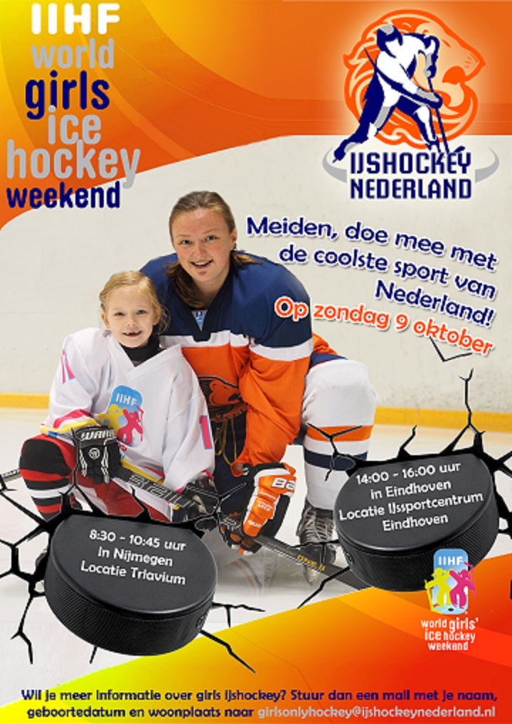 Meiden, willen jullie de beginselen van ijshockey aangeleerd krijgen door speelsters van het Nationaal Vrouwen Team? Kom 9 oktober naar het Triavium. Van 08:30 tot 10:45 is er volop gelegenheid om te beleven hoe leuk ijshockey is, ook voor meisjes!