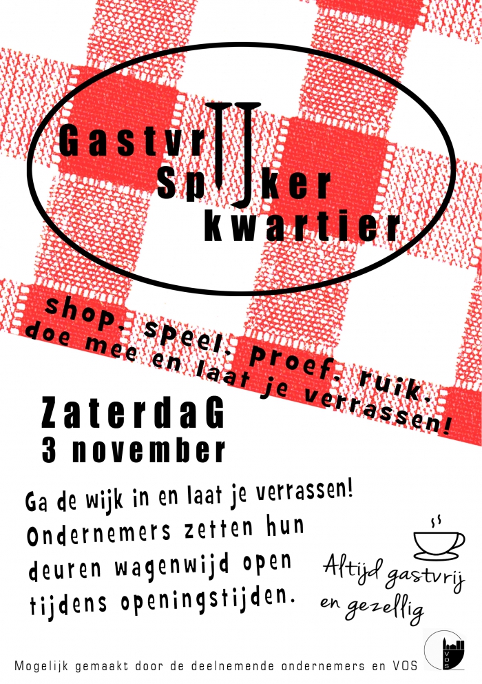 Verschillende ondernemers zetten op zaterdag 3 november hun deuren wagenwijd open en organiseren iets extra’s om het Spijkerkwartier nog gezelliger te maken. Kinderen kunnen bij Novabikes hun fietsband leren plakken, een slager en kaaswinkel organiseren een proeverij op de stoep en een kapsalon in de Driekoningenstraat laat haar vintage haar&opsteek-kunsten zien waarna de modellen op de foto gezet worden in de pop-up fotostudio maar er gebeurt nog veel meer die dag.