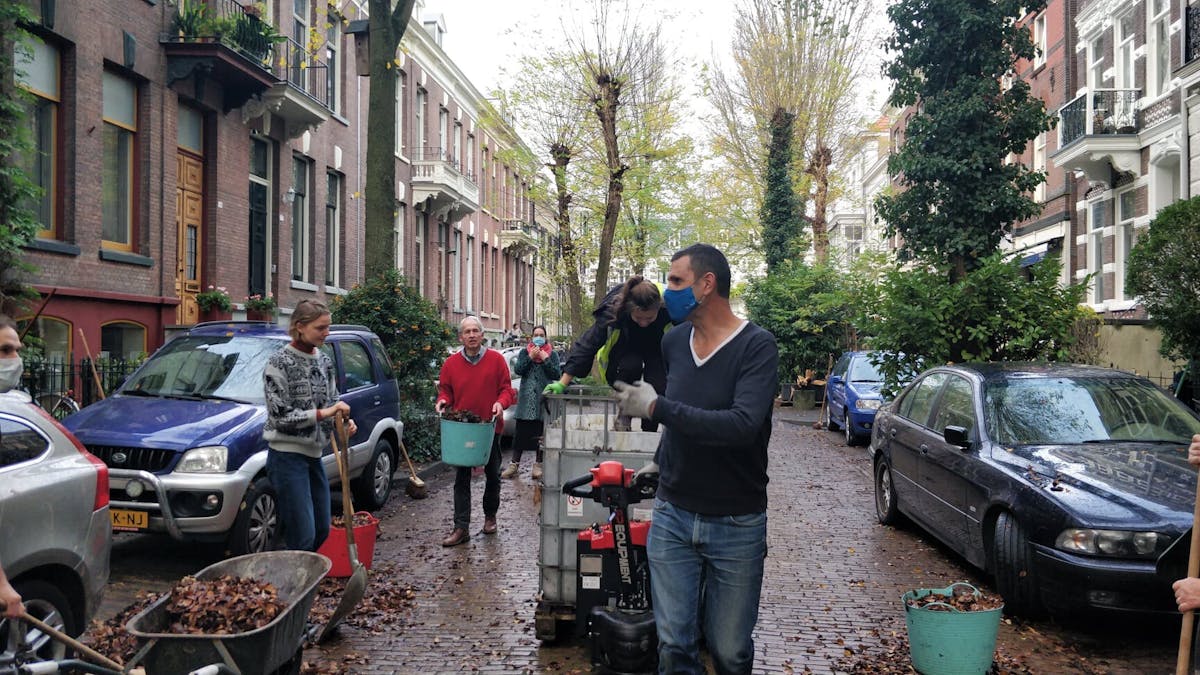 Net als vorig jaar gaan we in de straten van het Spijkerkwartier blad vegen en verwerken in de boomspiegels.