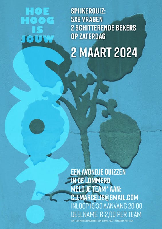 Zaterdagavond 2 maart om acht uur. Inloop vanaf half 8. 5 rondes van 8 vragen. Meld je vooraf aan met je straatteam. Kosten 12 euro per team. Maximaal 6 personen per team en zonder telefoon.