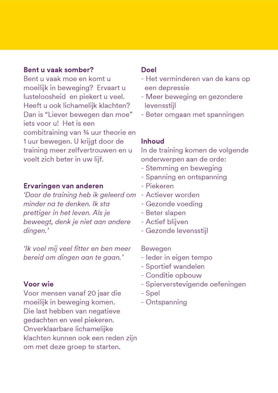 Voor wie: Voor mensen vanaf 20 jaar die moeilijk in beweging komen. Die last hebben van negatieve gedachten en veel piekeren. Onverklaarbare lichamelijke klachten kunnen ook een reden zijn om met deze groep te starten.