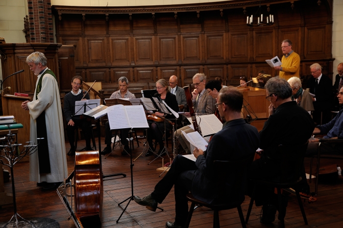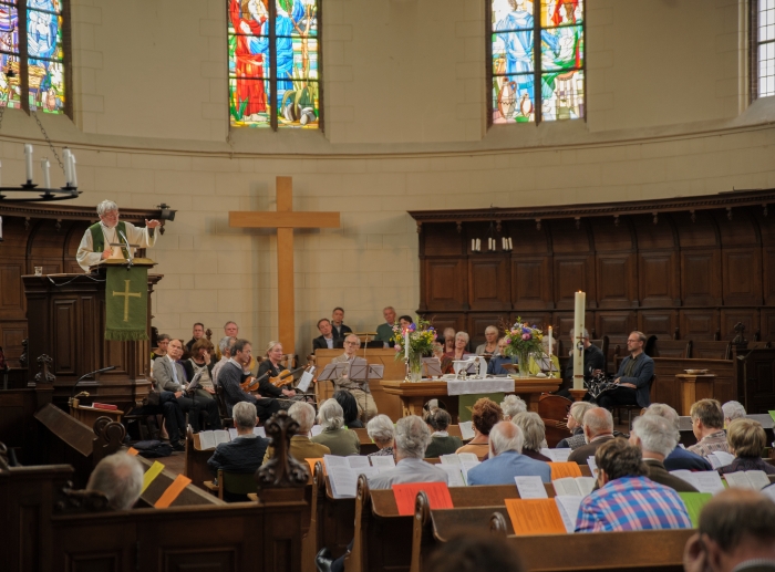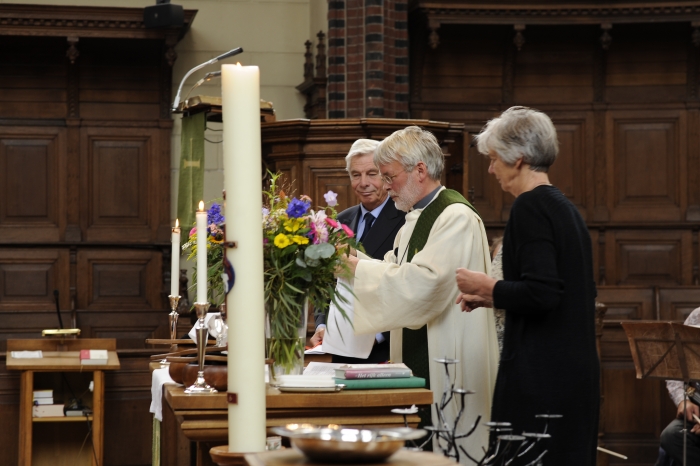 Wat is de omgangsvorm tussen jou en kerkgangers? ‘Ik hecht er aan dat mensen die ik ken mij bij mijn voornaam noemen. Dus nabijheid en toegankelijkheid. Veel mensen spreken mij voor de dienst even aan over allerlei persoonlijke zaken. Als een Nederlander het over mij heeft zegt hij, dat is mijn dominee. Een Surinamer zegt, dat is onze dominee. Want ik ben dan de dominee voor de hele familie. Ik ken een Surinaamse familie in vijf generaties. De oermoeder heb ik begraven, de jongste telgen heb ik gedoopt en anderen getrouwd. Dat vind ik fantastisch.’ Kun je jullie leden karakteriseren? ‘Wij hebben ruim driehonderd leden. Hoofdzakelijk hogere middenklasse, academici van gemiddeld boven de vijftig. Hoewel er relatief veel jongeren lid zijn. Over het algemeen zijn vrouwen religieuzer dan mannen, bij ons is dat 50/50.’ Zaten mannen en vrouwen ooit apart in jullie kerk? ‘Misschien in vorige eeuwen. Nu heeft de lutherse kerk een vrouwelijke bisschop in Nederland. Een meerderheid van de predikantschappen wordt in Nederland op dit moment door vrouwen vervuld. Je hebt een goed verdienende partner nodig, anders red je het niet’ (lacht).
