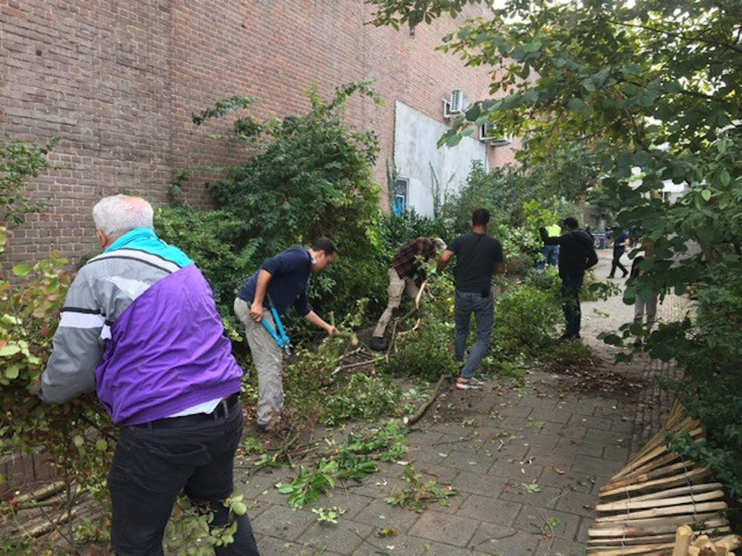Er waren 30 man aanwezig om te snoeien, planten en te sjouwen met tegels.