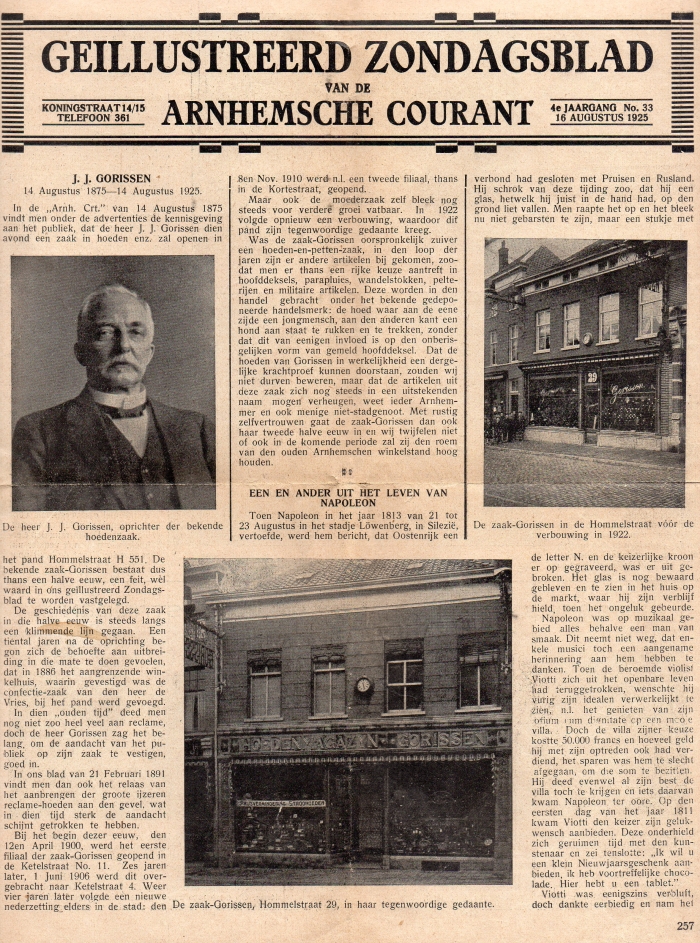 Het Geïllustreerd Zondagsblad van de Arnhemsche Courant bericht op 16 augustus 1925 over het vijftig jarig bestaan van de hoedenzaak. Een paar jaar eerder heeft die in de Hommelstraat een nieuw gezicht gekregen met in gekleurde tegels boven de etalages de aanduiding 'Hoedenmagazijn Gorissen'. Overigens maakte de familie Gorissen zelf geen hoeden, maar kocht ze in en verkocht ze onder eigen merk aan de detailhandel: 'en gros' en 'en detail'. Hun assortiment varieerde van 'hoge zijen' tot dagelijkse petten en helmen voor het Nederlandse leger. Ook verkochten ze parapluis, wandelstokken en 'pelterijen': bontwerk; vermoedelijk in de vorm van bontmutsen en -kragen.