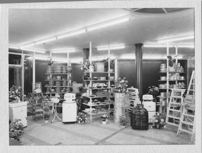 Het interieur van de winkel op Hommelstraat 54 op de dag van de opening , 28 november 1956. (De tegelvoer ligt er nog steeds).
