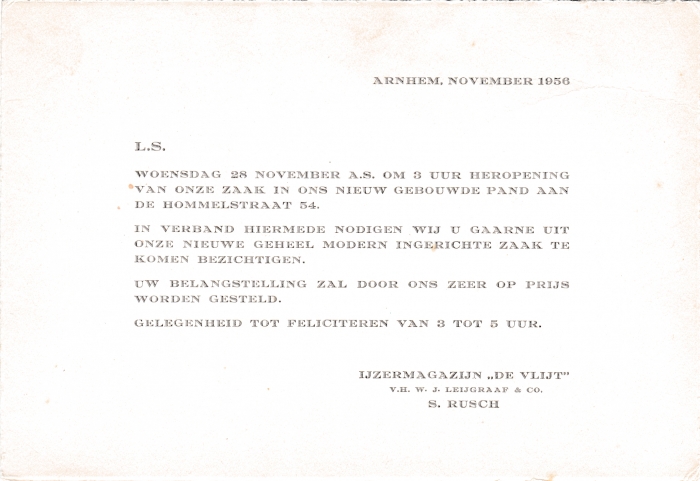 In de jaren vijftig gingen de zaken goed in de Hommelstraat. Je kon er alles kopen wat je nodig had: eten, schoenen, kleren, fietsen, tabakswaren, koffie en thee, gereedschap, meubels, lampen, hoeden en petten, speelgoed. De zaterdagse markt was een trekpleister voor de hele stad. De straat vertoonde nog wel wat sporen van oorlogsschade, in de vorm van gaten in de bebouwing. Zo lag er aan de overkant van Leijgraaf een perceel braak waarop groenteboer De Haas zijn waren uitstalde. Dat perceel was te koop. Na de plotselinge dood van Willem Leijgraaf in 1952 besloot Simon Rusch er werk van te maken. Hij liet er zijn nieuwe winkel bouwen, met een woning erboven. Hoewel er centrale verwarming in de ruime woning werd aangelegd, liet hij voor de zekerheid ook een schoorsteen inbouwen, voor het geval er toch een kachel nodig was. Hij had de oorlog meegemaakt en wilde op alles voorbereid zijn…