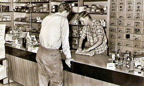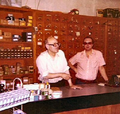 Rond 1980: vader en zoon Rusch samen in de winkel