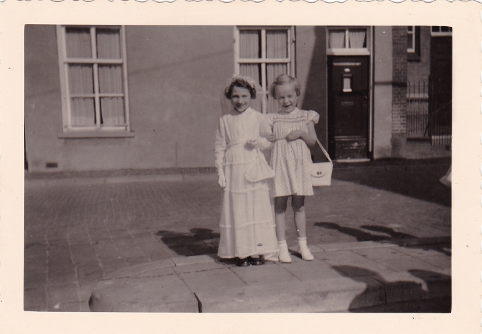 Trudi met haar vriendinnetje Agnes ten Broeke als bruidje in de Patersstraat, links van de School met de Bijbel