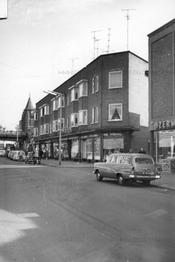 Uitzicht op de Oude Klarendalseweg, met rechts het uithangbord van groenteboer De Haas en links de toegangspoort van bakkerij Kusters