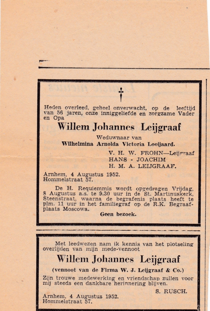 'Vader was in 1912 in Oosterbeek geboren, in de Wilhelminastraat,' vertelt Simon junior die in 1943 in datzelfde huis is geboren. Na de evacuatie van Oosterbeek verbleef hij van eind september 1944 tot de zomer van 1945 met zijn ouders in de Woeste Hoeve, tussen Arnhem en Apeldoorn. Na de oorlog vervolgde zijn vader zijn loopbaan bij R.S. Stokvis, groothandel in huishoudelijke apparaten aan de Weerdjesstraat, onder andere bekend van het merk Erres. 'Op een gegeven moment vroeg Willem Leijgraaf, die daar vaak als klant over de vloer kwam, mijn vader om zijn compagnon te worden in zijn zaak op Hommelstraat 57. Hij had twee dochters en zocht een vennoot en opvolger. Na enig aarzelen over het geld dat daarmee gemoeid was, heeft mijn vader toen het huis in Oosterbeek verkocht en zijn we verhuisd naar Bouriciusstraat 11, een groot herenhuis waar toen meerdere gezinnen woonden. Daar is in 1950 Trudi geboren.'