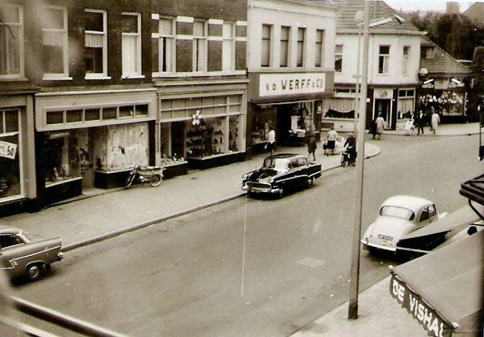 Uitzicht op de Hommelstraat naar het noordwesten, met aan de overkant de schoenenwinkel van Oderkerk en de woninginrichtingszaak van Van der Werff, café Willemsen en verlichtingszaak Besseling en rechtsonder de viswinkel van Jur van der Berg
