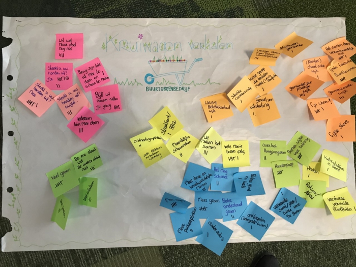 Zoals u misschien gezien heeft zijn wij de laatste weken actief geweest met de kruiwagen om daarmee jullie meningen en behoeften te horen. Hiermee hebben we "kruiwagenverhalen" opgehaald. Afgelopen week hebben we een poster gemaakt van jullie reacties en hieruit willen we graag gaan kijken hoe we verder kunnen om gericht iets te gaan ondernemen. Wat zou u bijvoorbeeld vinden van een maandelijkse opschoondag met de wijk of weet u een oplossing voor het hondenpoepprobleem?