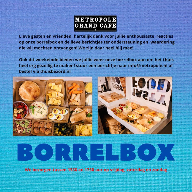 Graag attenderen wij julllie op onze luxe borrelbox voor > 2 pp die wij thuisbezorgen. Meer informatie: www.metropole.nl of op facebook of instagram.