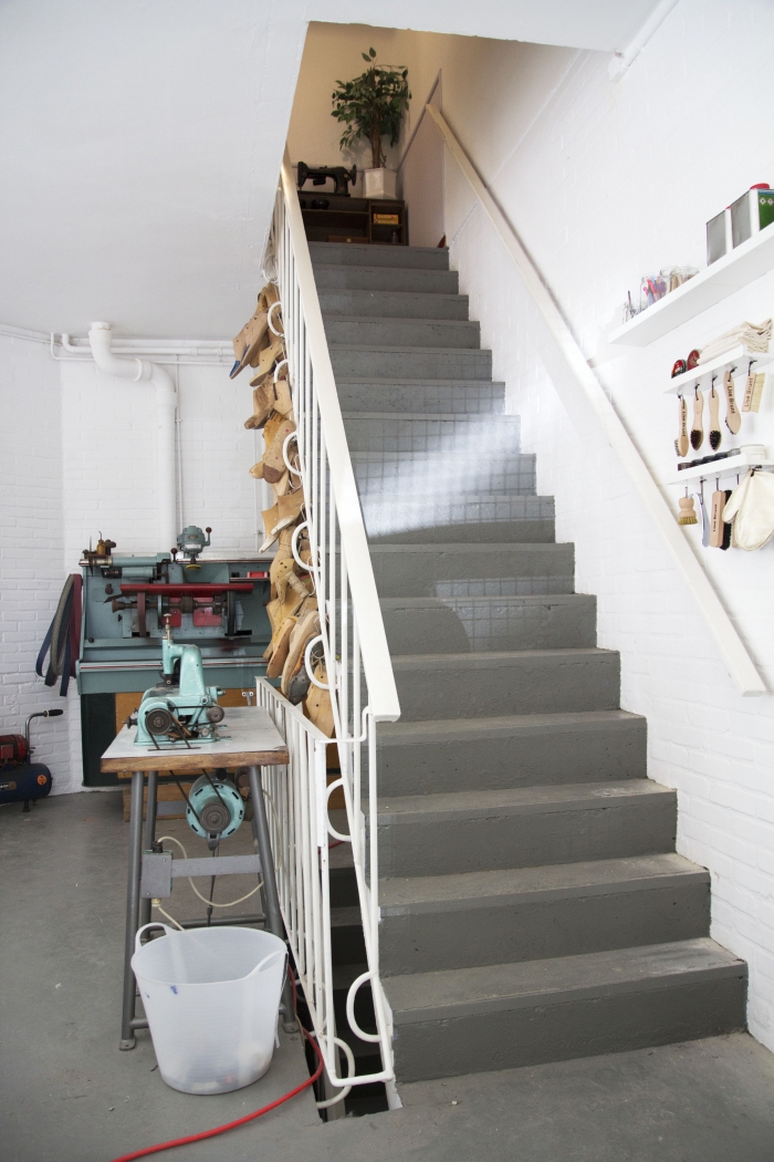 Tijdens ons gesprek hangt een overbuurman, af en toe spugend, uit het raam. Lise:”het is toch een erg leuke buurt hier, heel afwisselend, er komt van alles langs, we zitten ook goed in de loop van de stad de wijk in. Cursisten vinden dat levendige ook vaak leuk. We zijn gestart in de kleine Campus in 2014 en hebben 7 panden bekeken door heel Arnhem, voordat we voor dit pand van SLAK hebben gekozen”. Sinds april 2016 zit Lise samen met de andere ontwerpers: Luc Aarts, Roderick Pieters, Joyce Verhagen en Josefien Ubbink (gemeenschappelijke deler affiniteit met schoenen) naar tevredenheid in het pand. “Er lopen hier veel junks, die gebruiken hier achter ook, dat is weleens minder prettig, maar aan de andere kant is er positieve sociale controle. Er wordt ook op ons ‘gelet’ en wij nemen weer pakjes aan voor de buurt. Laatst kwam een overbuurman ons nog eten brengen en iemand anders allemaal restjes leer”!