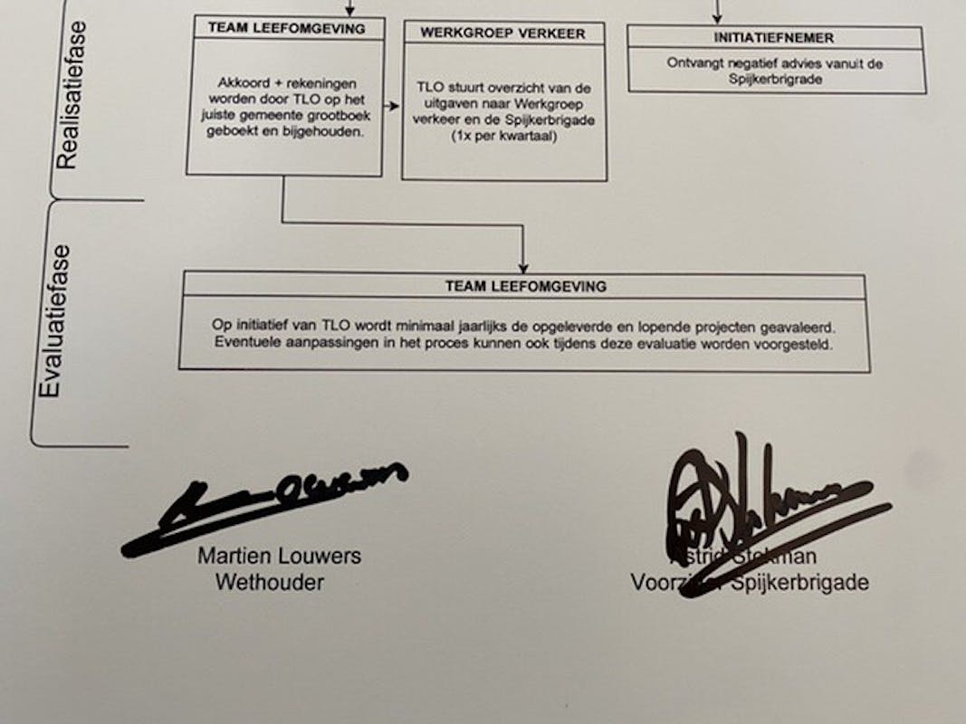 Vrijdagmiddag 25 februari zetten wethouder Martien Louwers (wethouder wijken) en Astrid Stokman (voorzitter van de Spijkerbrigade), hun handtekening onder de ‘Flowchart’ (werkproces) voor het besteden van de meeropbrengsten uit het Parkeerplan Spijkerkwartier. In dit Parkeerplan, dat in 2018 in werking trad, is vastgelegd dat de meeropbrengsten uit het Parkeerplan bestemd zijn voor verbetering van de wijk. Bewoners kunnen zélf initiatieven hiervoor aandragen via het Wijkoverleg.