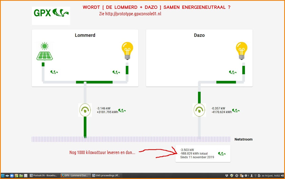 Na de start van de meting 11 nov 2019 is inmiddels bijna het energieneutraal-punt bereikt voor Lommerd en DAZO samen. Kijk hier voor de actuele stand van GPXconsole01 die dat toont (LIVE). De diepste stand was begin maart toen de Lommerd op -7000 kWh stond en de DAZO op -2000, samen -9000. Van die laatste is nu nog een kleine 1000 kWh te gaan, daarna zijn Lommerd en DAZO samen energie-positief (elektrisch). GPX werkt tot komende winter aan een multi-user concept, om meer te kunnen koppelen met deze balansmeter.