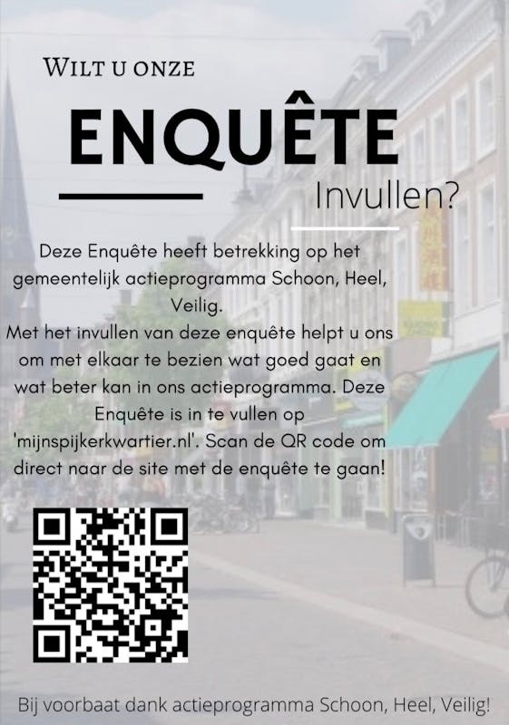 Deze enquête heeft betrekking op het gemeentelijk actieprogramma Schoon, Heel, Veilig. Met het invullen van deze enquête helpt u ons om met elkaar te bezien wat goed gaat en beter kan in het actieprogramma. Deze enquête kunt u via de link hieronder invullen, of via de QR code bovenaan dit bericht. Bij voorbaat dank; actieprogramma Schoon, Heel, Veilig.