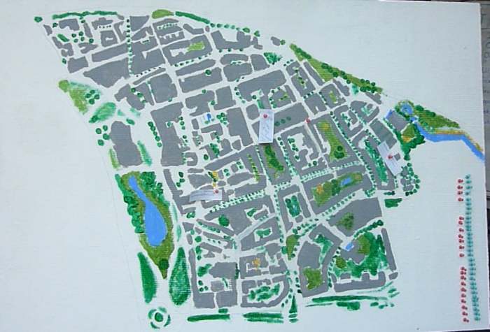 De kaart is op een prikbord geschilderd waar we graag op aan willen geven waar in de wijk het opgeschoond moet worden of opgeschoond is, mocht u plekken weten waar u vindt dat het meer opgeschoond moet worden, dan kunt u deze opdracht letterlijk op de kaart zetten met een punaise en een label op deze kaart in de DAZO.