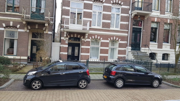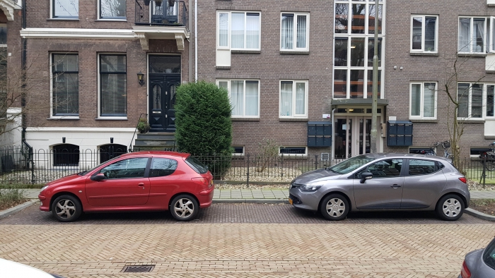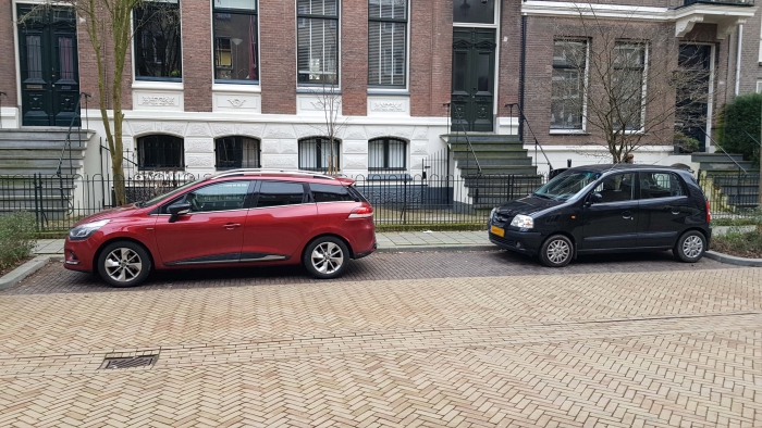 Deze variabele parkeerruimte is juist ook zo effectief omdat er niet maar één maat auto bestaat. Er parkeren in de buurt grotere en kleinere auto’s. We hebben niet allemaal een hele grote auto die persé 6 meter nodig heeft om te kunnen worden geparkeerd. Enorm veel auto’s staan met gemak met z’n tweeën in 10 of 11 meter ruimte. Het proefvak bewijst dit al. Maar ook daar wil de gemeente nu alsnog die standaard maat gaan toepassen. De parkeerruimtes waar nu twee auto’s staan maar die niet voldoen aan de precieze standaard van 12 meter voor twee auto’s gaan worden teruggebracht tot één parkeerplek van 6 meter. De rest van de meters wordt plantsoen. Op onderstaande foto’s zie je drie voorbeelden in het proefvak waar de parkeerruimte niet voldoet aan 12 meter voor twee auto's en waar de gemeente dit wil gaan doen: