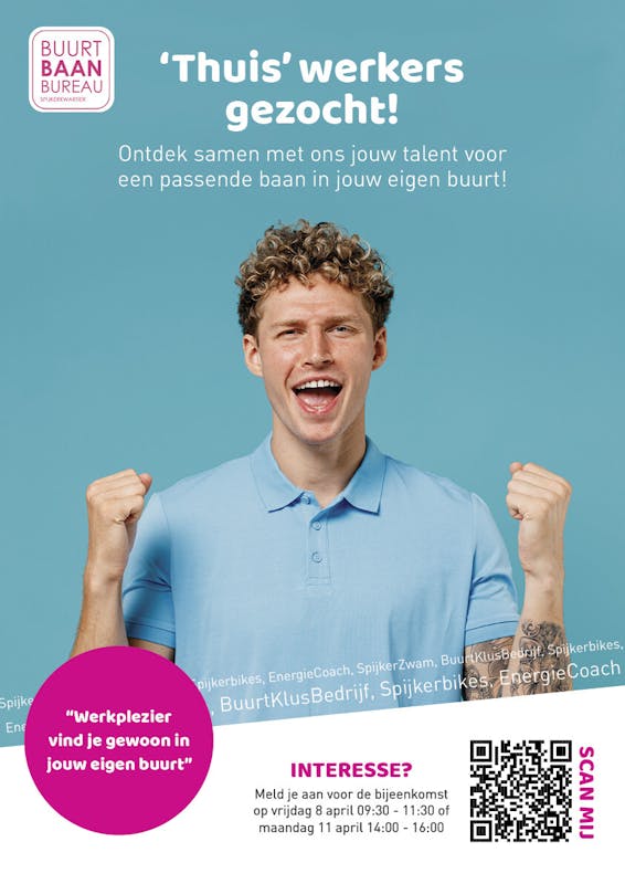 Werk maken van je hobby? Het BuurtBaanBureau kan je helpen. In en rond het Spijkerkwartier zijn veel leuke projecten, winkels en ondernemers waar jij aan de slag kunt. Denk aan klussen of koken, oesterzwammen kweken of fietsen repareren. Het BuurtBaanBureau helpt jou je talent ontdekken en een fijne baan te vinden.