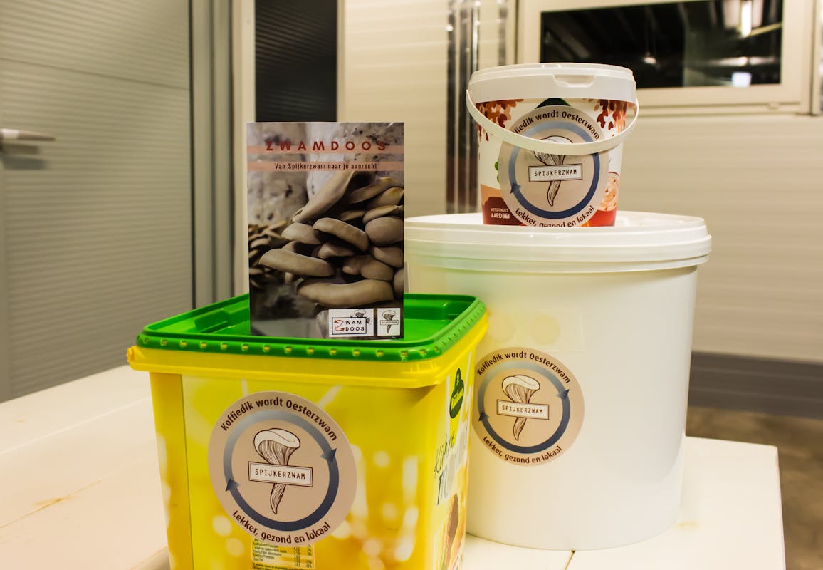 Omdat ze gemaakt zijn van tweedehands emmers, hebben we verschillende maten. De 1 liter emmers zijn tijdelijk €6,- Ideaal om samen met je kinderen het groeien van een paddenstoel te beleven. Als je een redelijk maaltijd wilt oogsten, kun je de 2,5 liter maat bestellen voor €12,50 of de 5 liter emmers voor € 15,- om nog meer zwammen in te kweken. Heb je broed nodig om je Zwamdoos opnieuw te starten? Dan kan je deze bestellen voor €4,50
