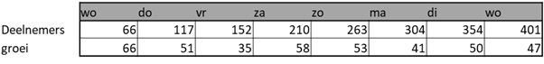 In totaal hebben 401 mensen meegedaan. In onderstaande grafiek zie je het aantal deelnemers per dag (oranje lijn) en het totaal aantal deelnemers (blauwe lijn).
